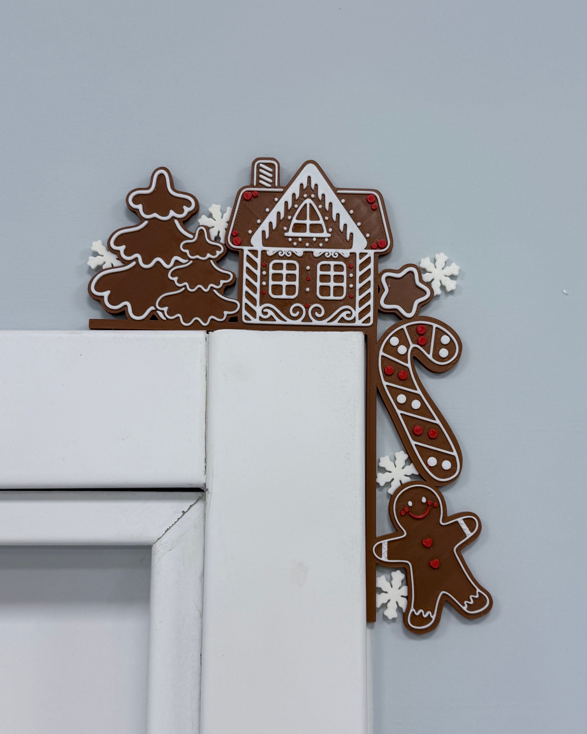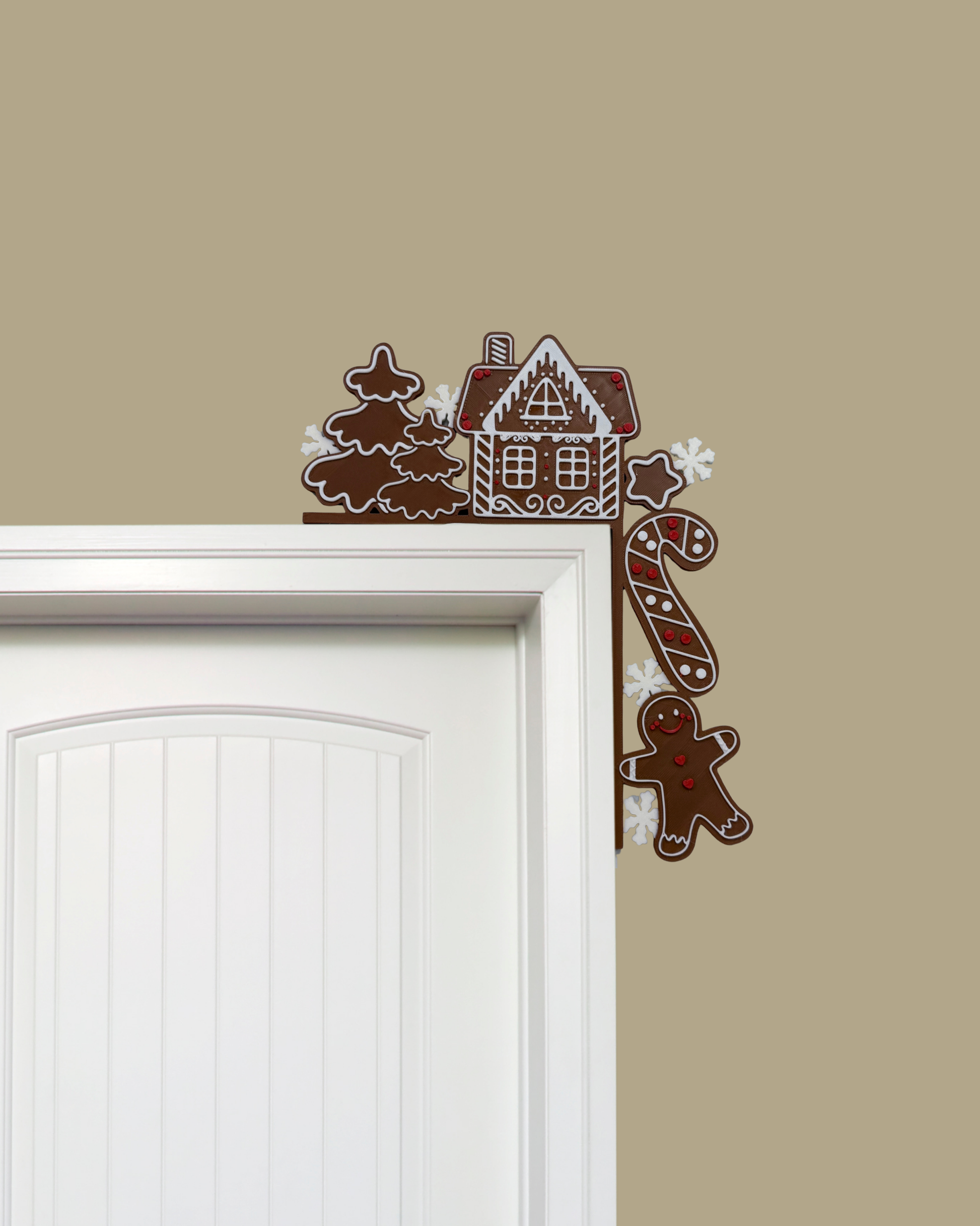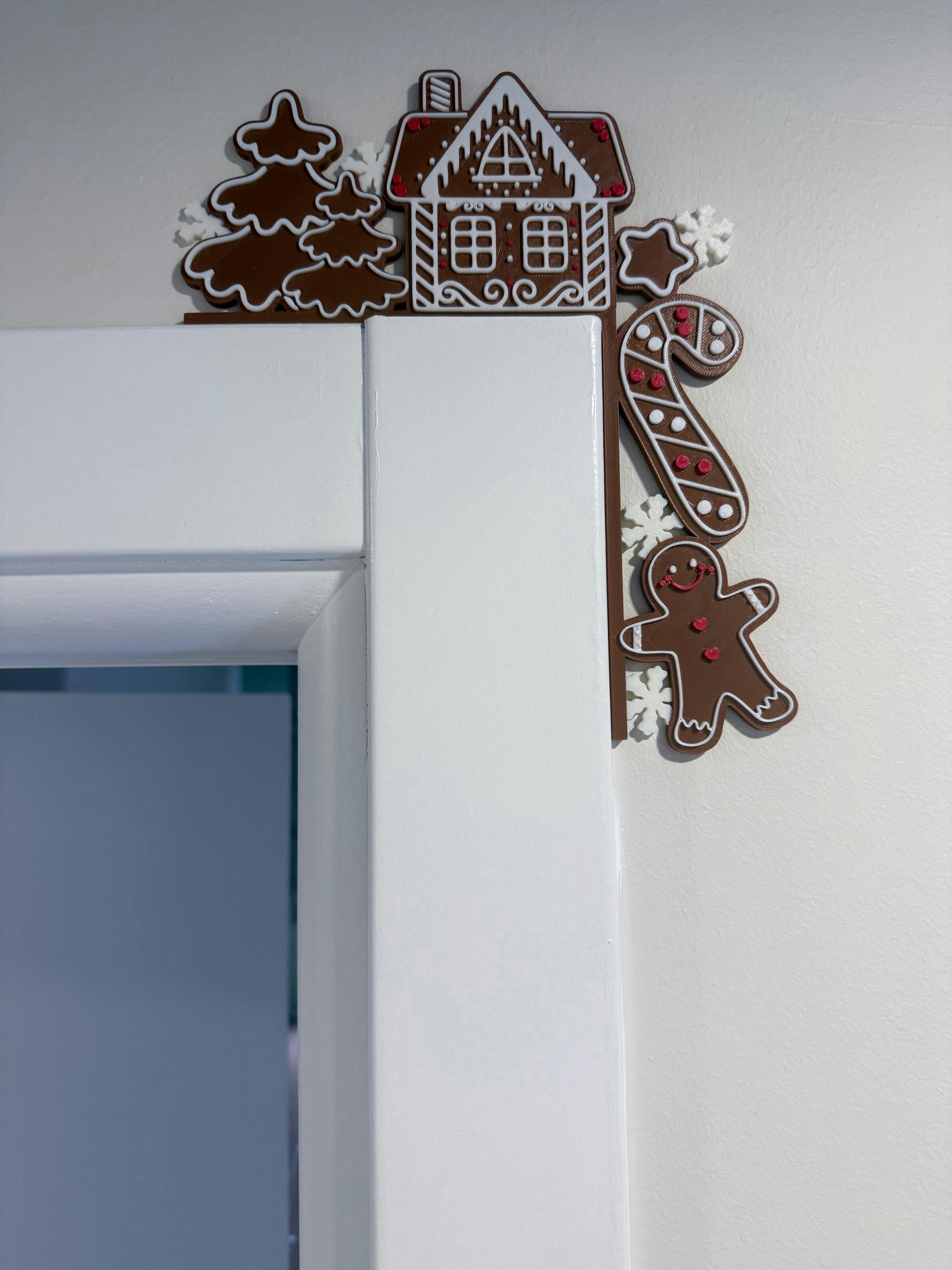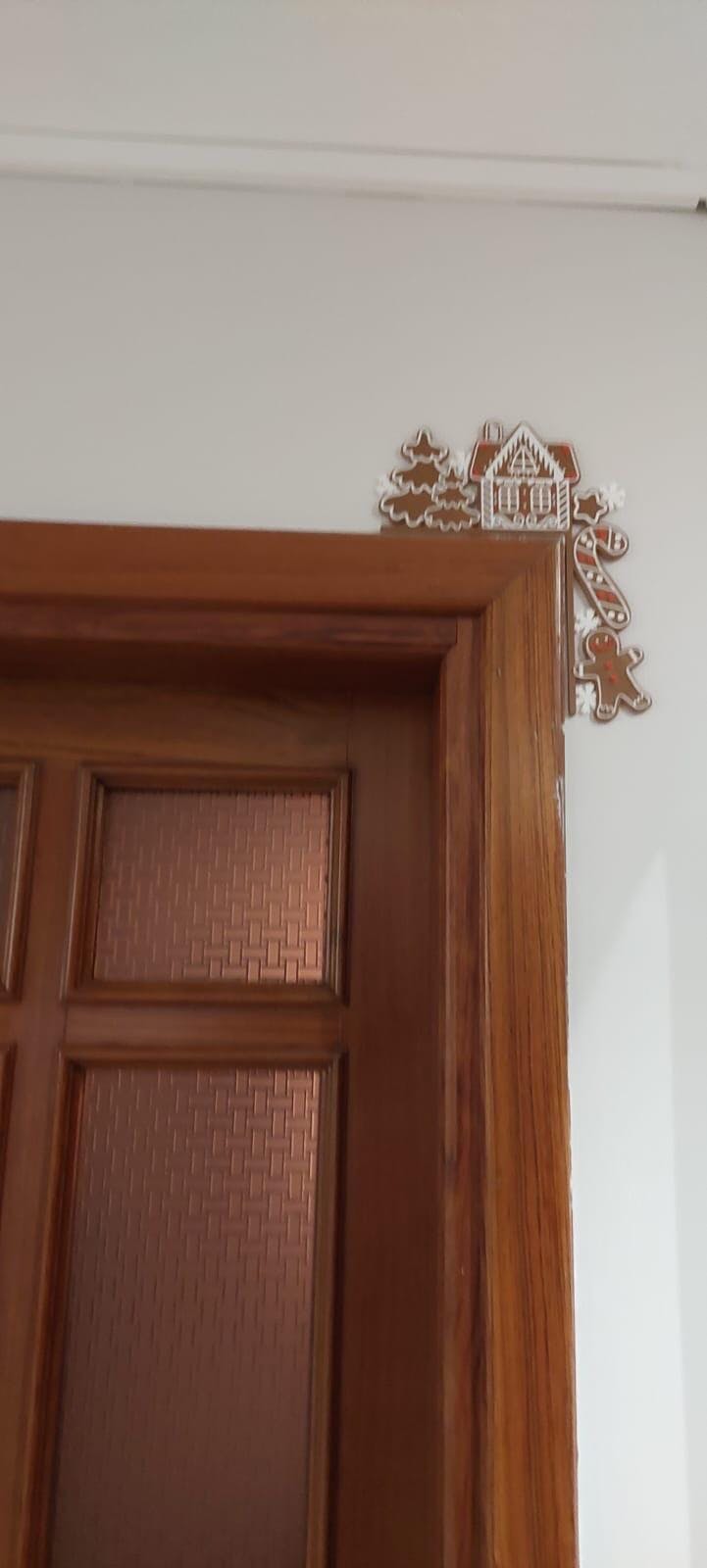 Kırmızı süslemeli gingerbread (zencefil) evleri, ağaçlar ve kurabiye şeklindeki sevimli detaylardan oluşan bu kenar süsü; yılbaşı dekoruna lezzetli ve tatlı bir atmosfer katar. Kapı köşelerine kolayca yerleşen tasarımıyla bulunduğu alana anında neşe getirir.