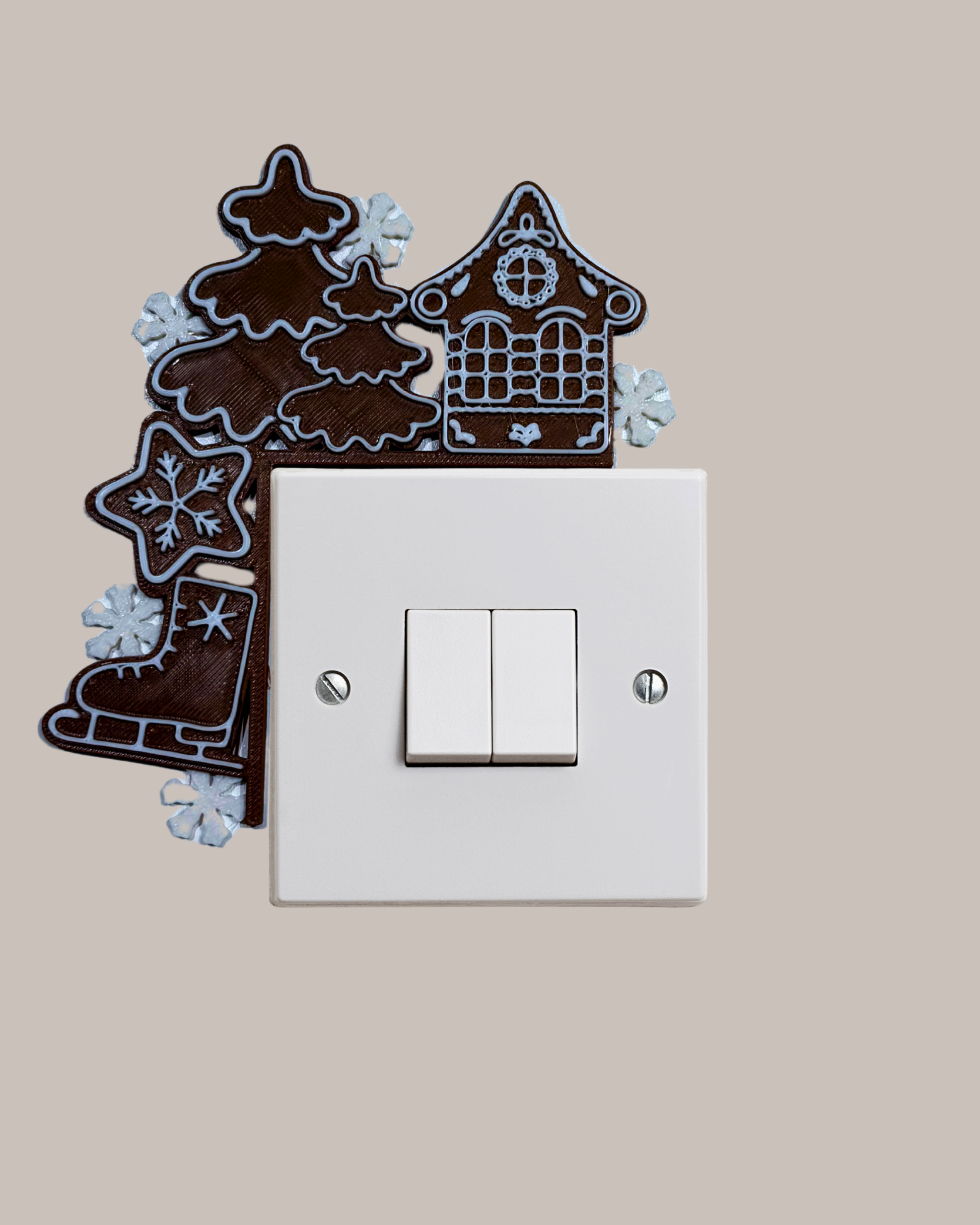 Yeni yıl evi, ağaçlar ve kış temalı kurabiye detaylarla hazırlanan bu ışık kenar süsü; yılbaşı dekorunuza sıcak ve tatlı bir atmosfer katar. Işık anahtarının çevresine kolayca yerleşen tasarımıyla bulunduğu ortamda anında yeni yıl ruhu oluşturur.